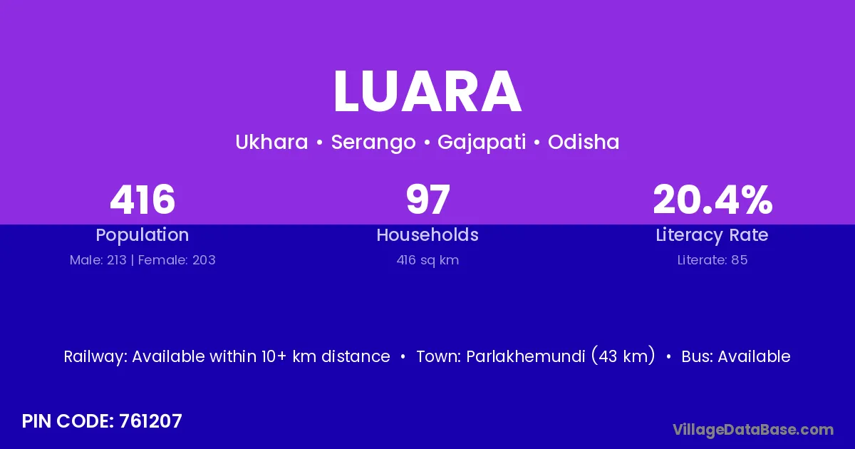 Parlakhemundi (43 km) is the nearest town to Luara village for major economic activities and is located approximately 43 km away.