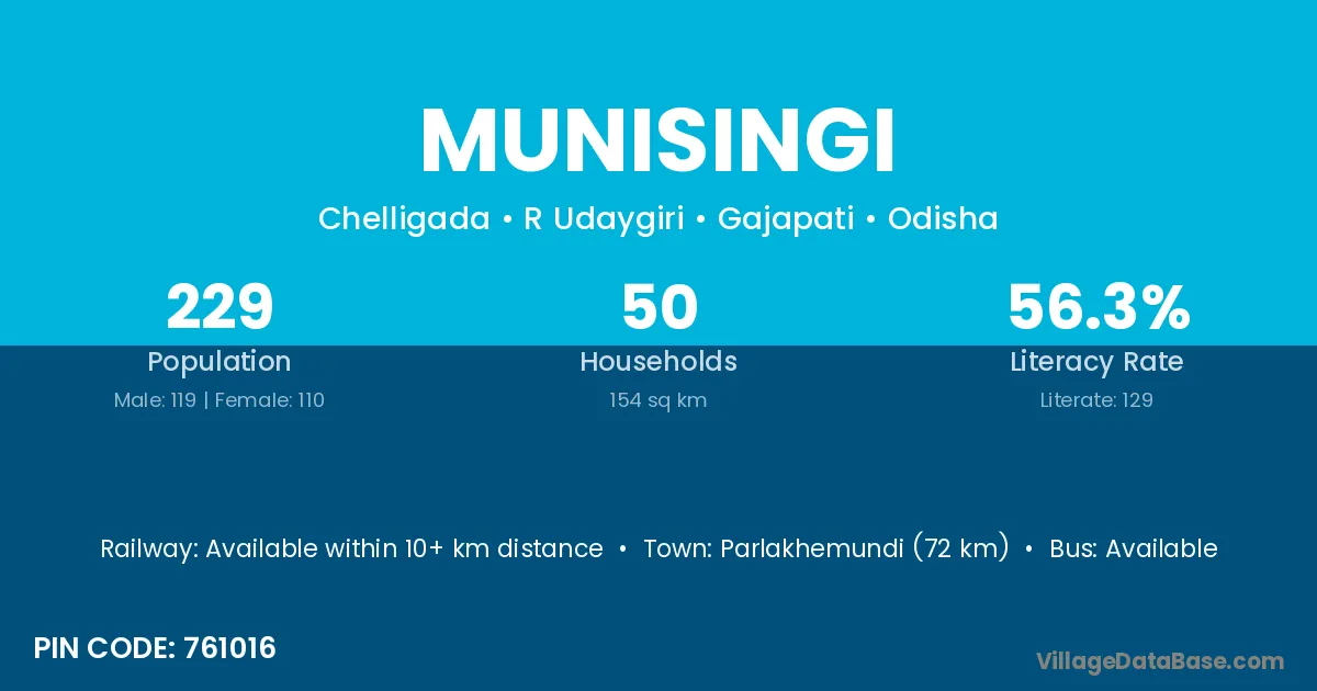 Parlakhemundi (18 km) is the nearest town to Munisingi village for major economic activities and is located approximately 18 km away.