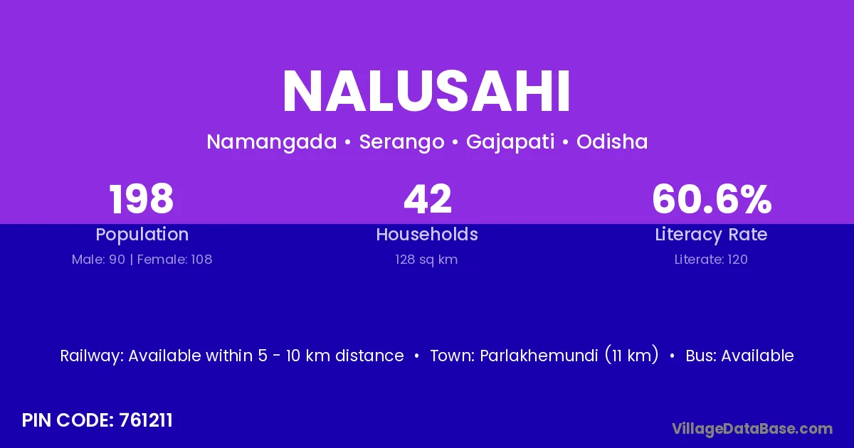 Parlakhemundi (11 km) is the nearest town to Nalusahi village for major economic activities and is located approximately 11 km away.