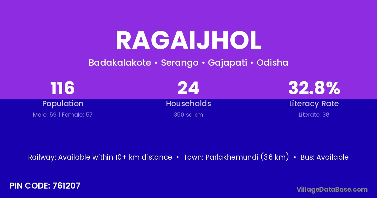 Parlakhemundi (36 km) is the nearest town to Ragaijhol village for major economic activities and is located approximately 36 km away.