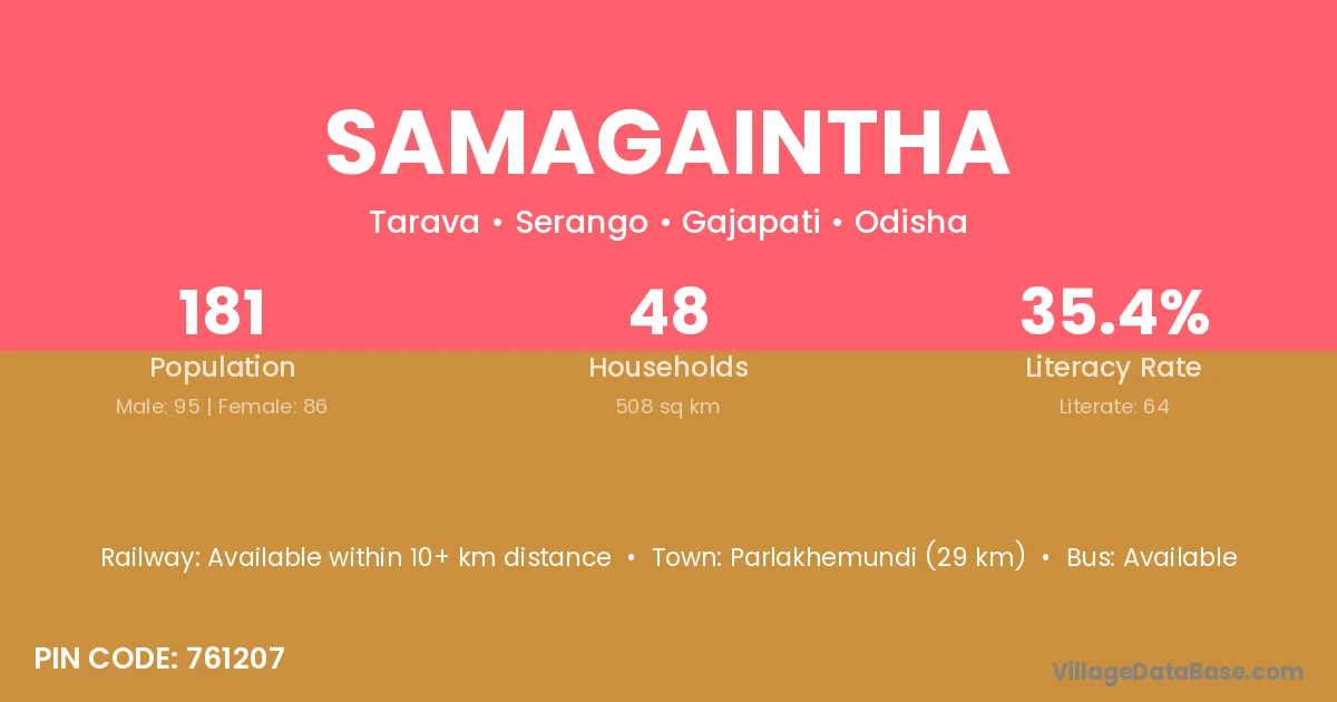 Parlakhemundi (29 km) is the nearest town to Samagaintha village for major economic activities and is located approximately 29 km away.