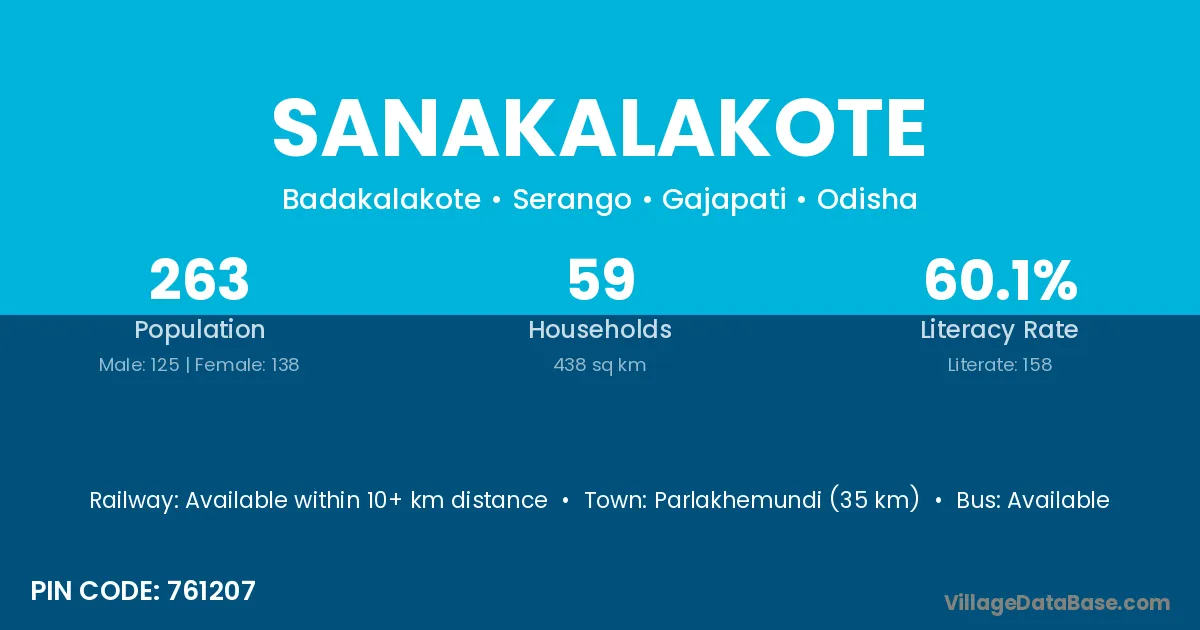 Parlakhemundi (35 km) is the nearest town to Sanakalakote village for major economic activities and is located approximately 35 km away.