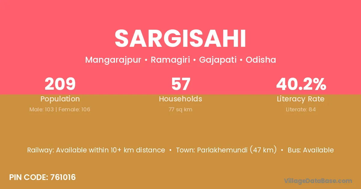 Parlakhemundi (55 km) is the nearest town to Sargisahi village for major economic activities and is located approximately 55 km away.