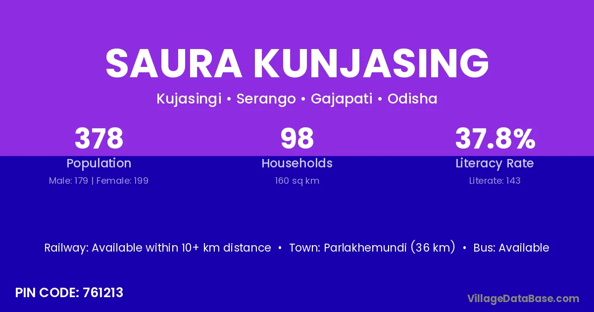 Parlakhemundi (36 km) is the nearest town to Saura Kunjasing village for major economic activities and is located approximately 36 km away.