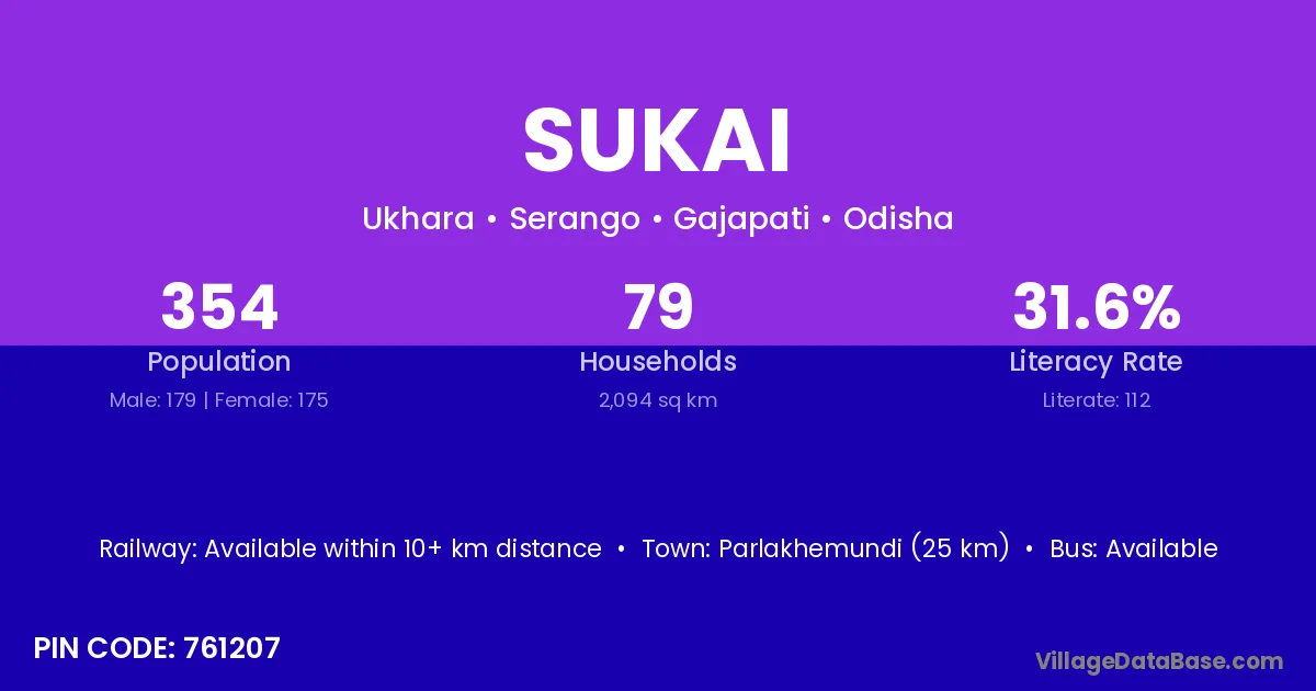 Parlakhemundi (25 km) is the nearest town to Sukai village for major economic activities and is located approximately 25 km away.