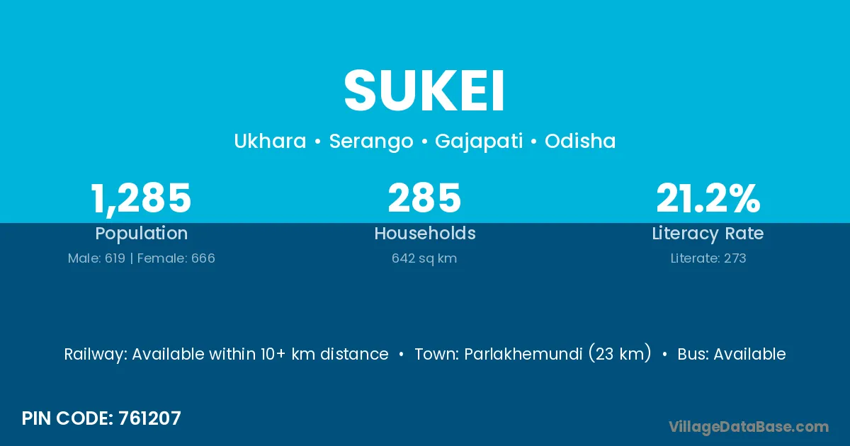 Parlakhemundi (23 km) is the nearest town to Sukei village for major economic activities and is located approximately 23 km away.