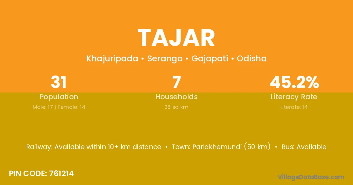 Parlakhemundi (50 km) is the nearest town to Tajar village for major economic activities and is located approximately 50 km away.