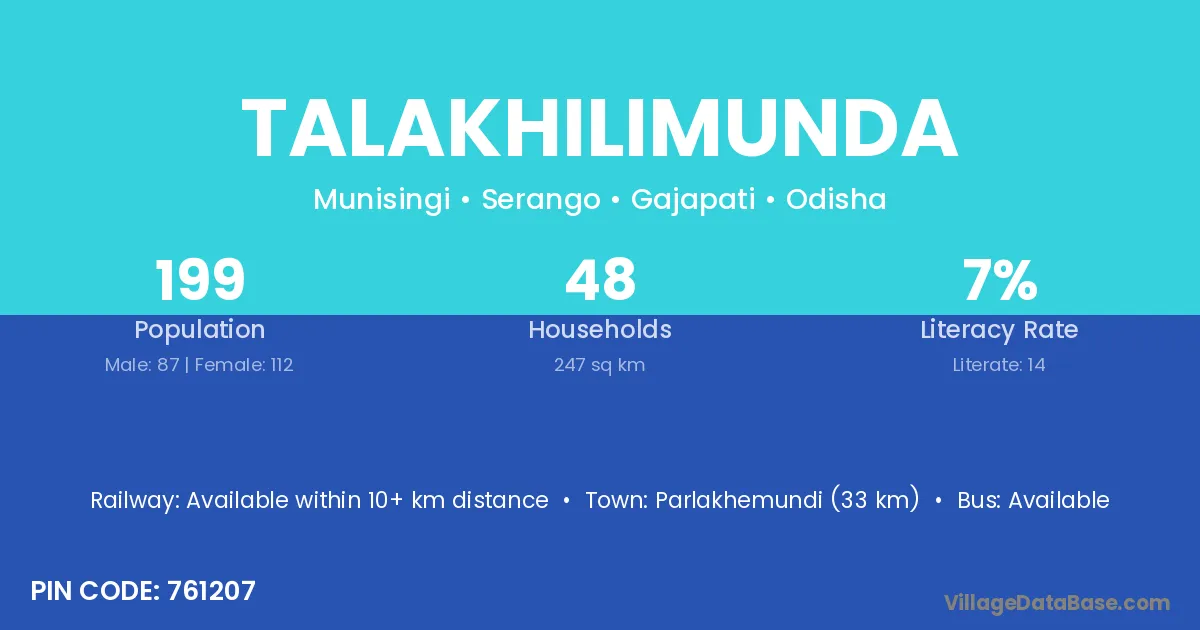 Parlakhemundi (33 km) is the nearest town to Talakhilimunda village for major economic activities and is located approximately 33 km away.