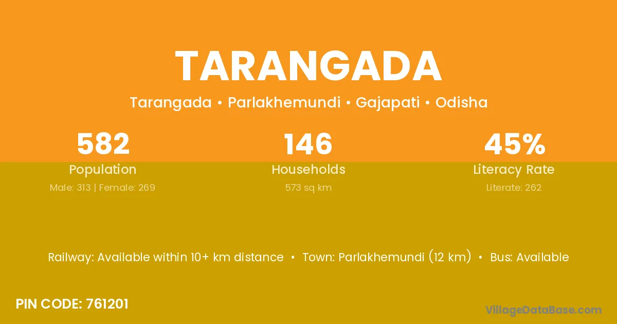 Parlakhemundi (64 km) is the nearest town to Tarangada village for major economic activities and is located approximately 64 km away.