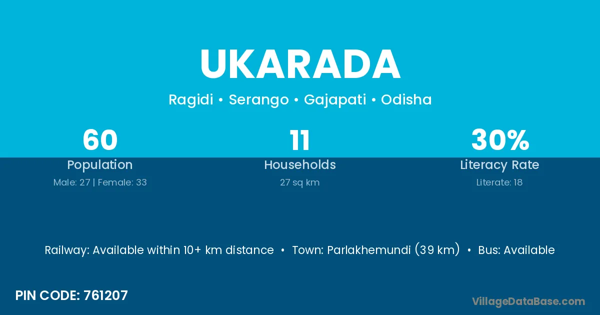 Parlakhemundi (39 km) is the nearest town to Ukarada village for major economic activities and is located approximately 39 km away.
