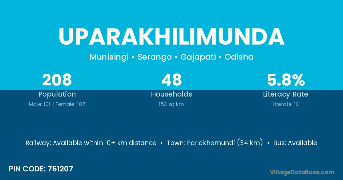Uparakhilimunda village has a total population of 208 people, of which 101 are males and 107 are females.