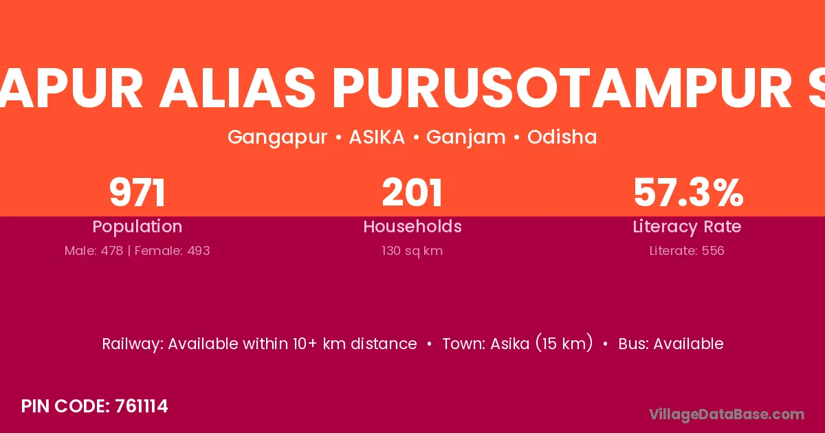 Gangapur Alias Purusotampur Sasan village has a total population of 971 people, of which 478 are males and 493 are females.