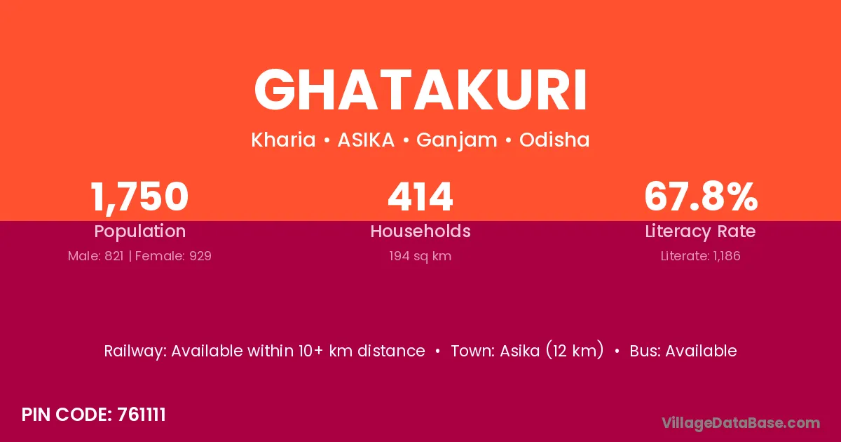 Asika (12 km) is the nearest town to Ghatakuri village for major economic activities and is located approximately 12 km away.