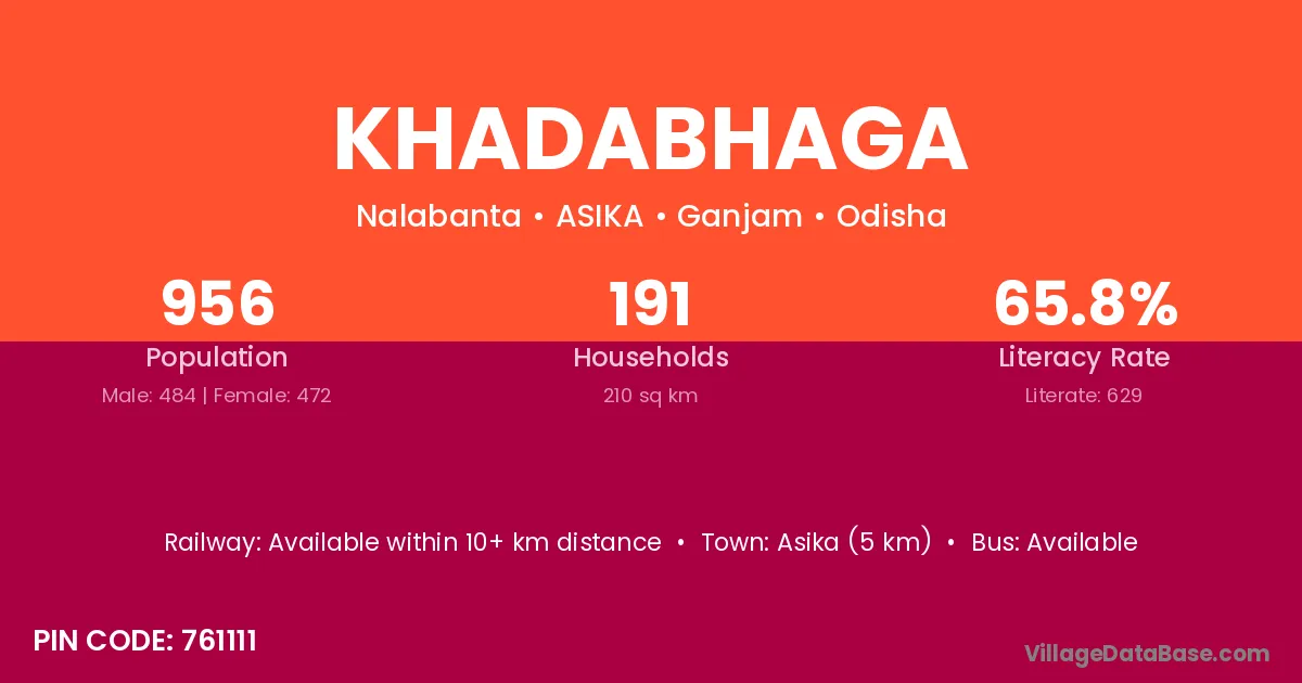 Khadabhaga village has a total population of 956 people, of which 484 are males and 472 are females.