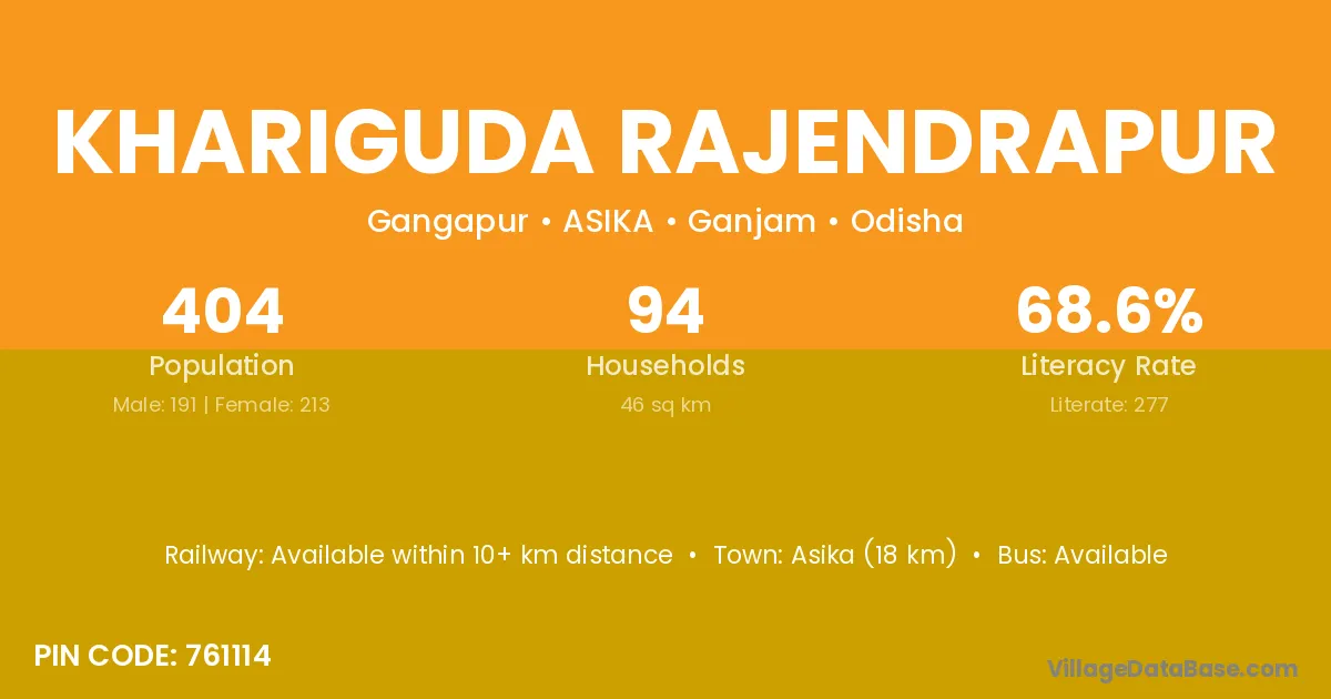 Asika (18 km) is the nearest town to Khariguda Rajendrapur village for major economic activities and is located approximately 18 km away.