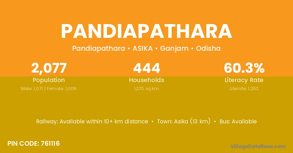 Asika (13 km) is the nearest town to Pandiapathara village for major economic activities and is located approximately 13 km away.