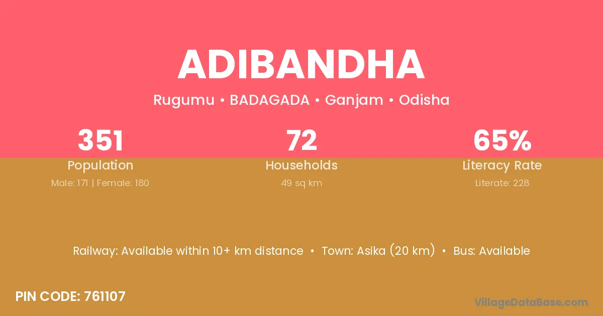 Asika (20 km) is the nearest town to Adibandha village for major economic activities and is located approximately 20 km away.