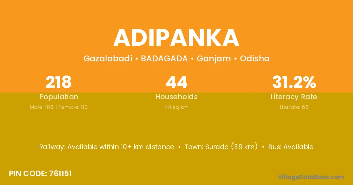 Adipanka village has a total population of 218 people, of which 108 are males and 110 are females.