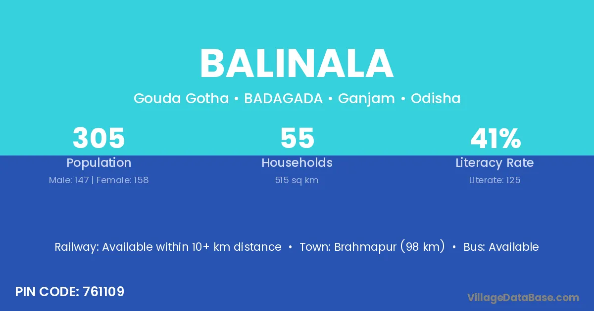 Brahmapur (98 km) is the nearest town to Balinala village for major economic activities and is located approximately 98 km away.