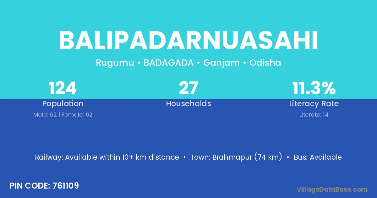 Brahmapur (74 km) is the nearest town to Balipadarnuasahi village for major economic activities and is located approximately 74 km away.