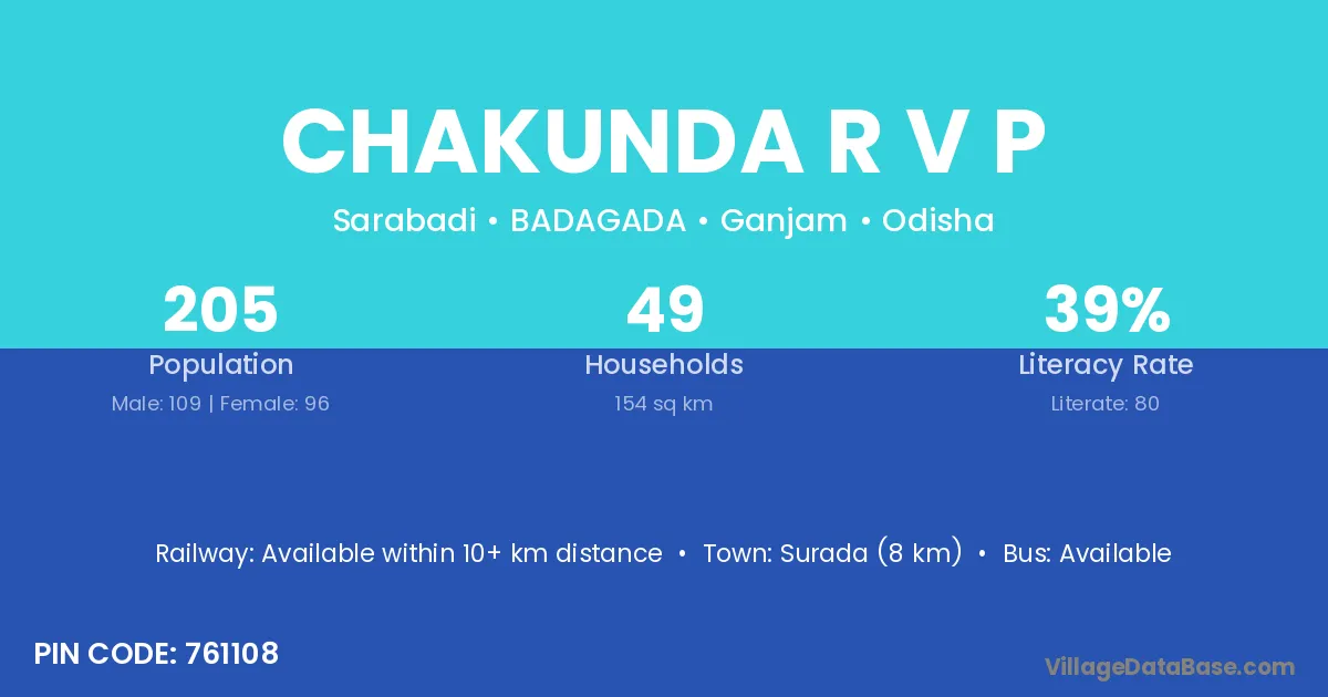 Surada (8 km) is the nearest town to Chakunda R V P village for major economic activities and is located approximately 8 km away.