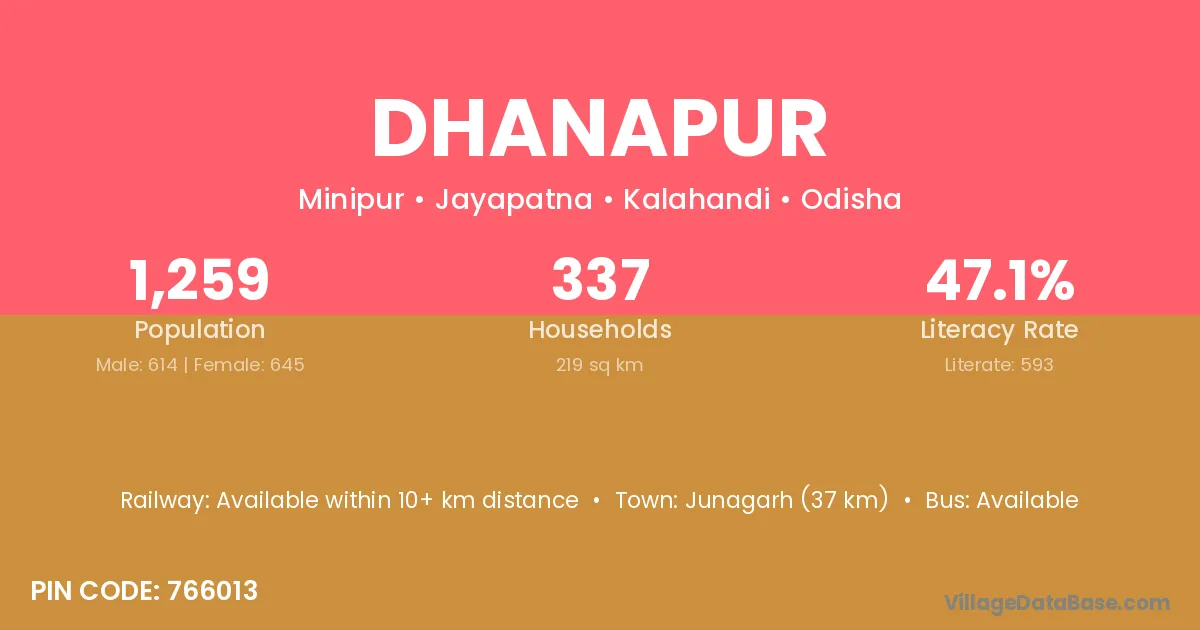 Brahmapur (84 km) is the nearest town to Dhanapur village for major economic activities and is located approximately 84 km away.