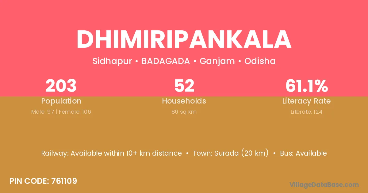 Dhimiripankala village has a total population of 203 people, of which 97 are males and 106 are females.