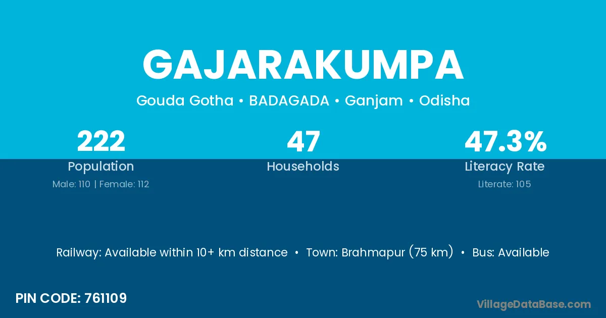 Brahmapur (75 km) is the nearest town to Gajarakumpa village for major economic activities and is located approximately 75 km away.