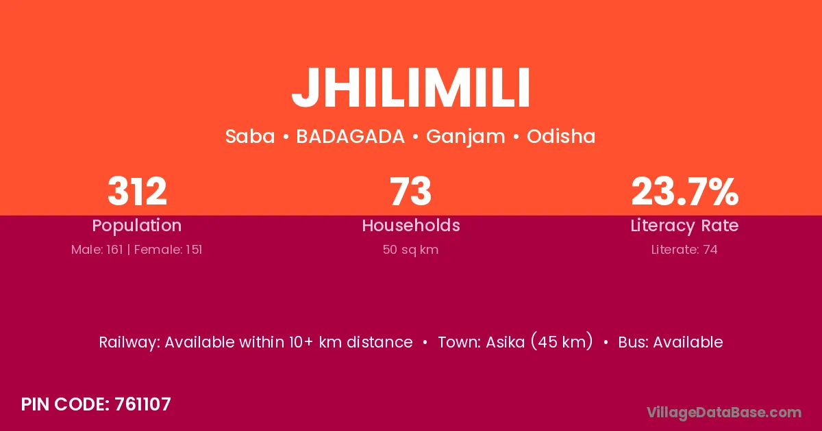 Asika (45 km) is the nearest town to Jhilimili village for major economic activities and is located approximately 45 km away.