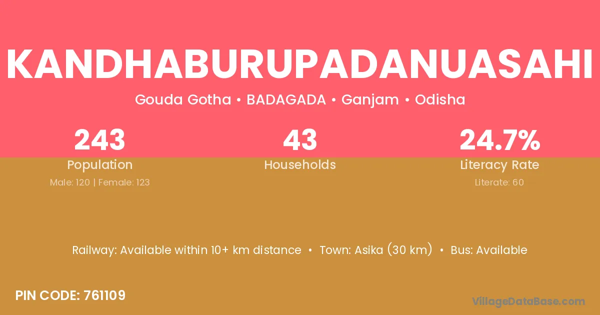 Kandhaburupadanuasahi village has a total population of 243 people, of which 120 are males and 123 are females.
