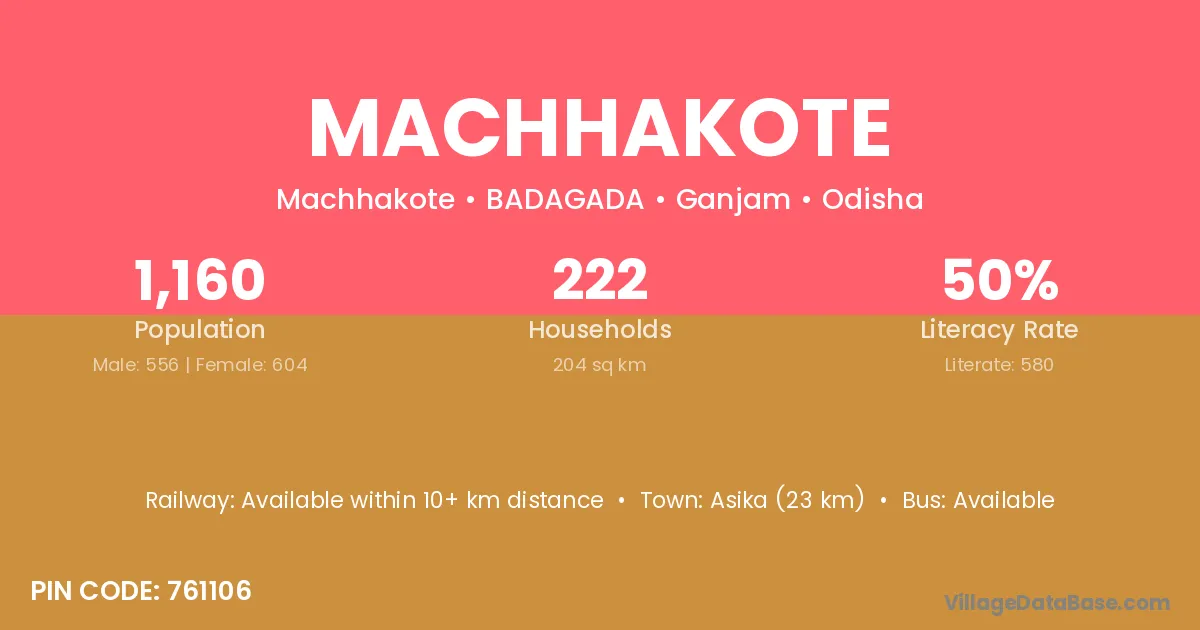 Asika (23 km) is the nearest town to Machhakote village for major economic activities and is located approximately 23 km away.