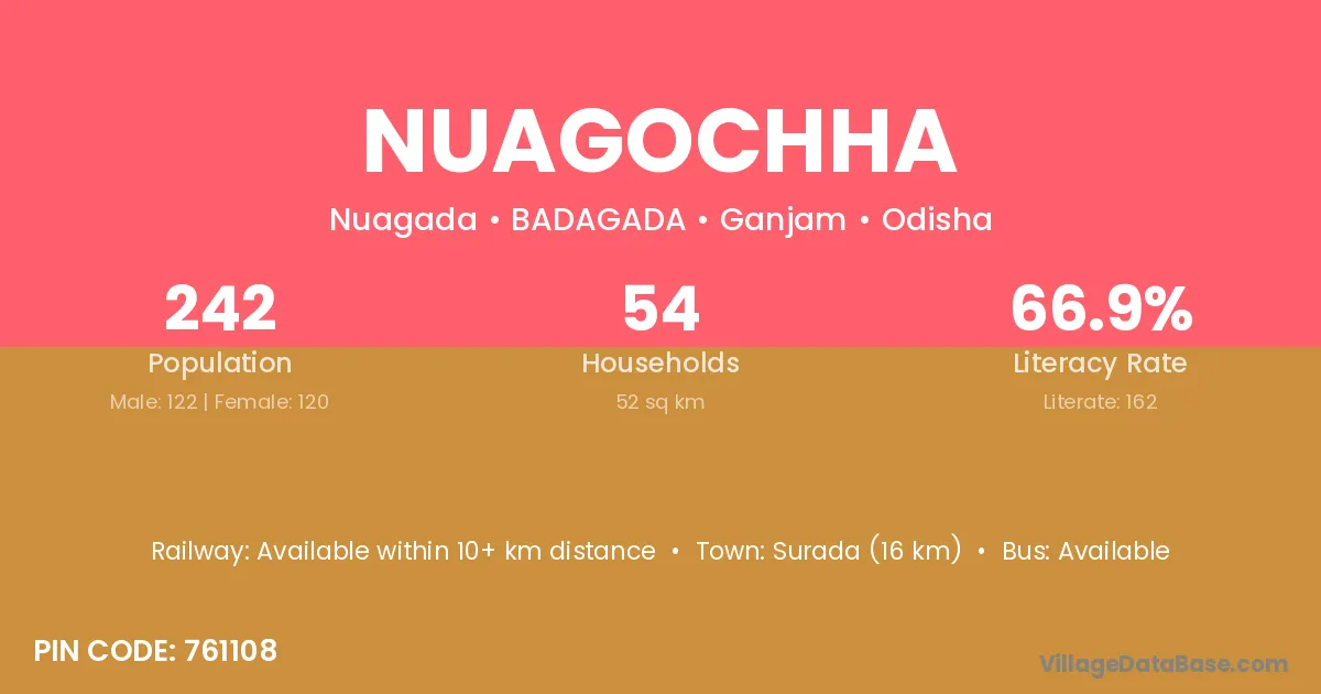 Nuagochha village has a total population of 242 people, of which 122 are males and 120 are females.