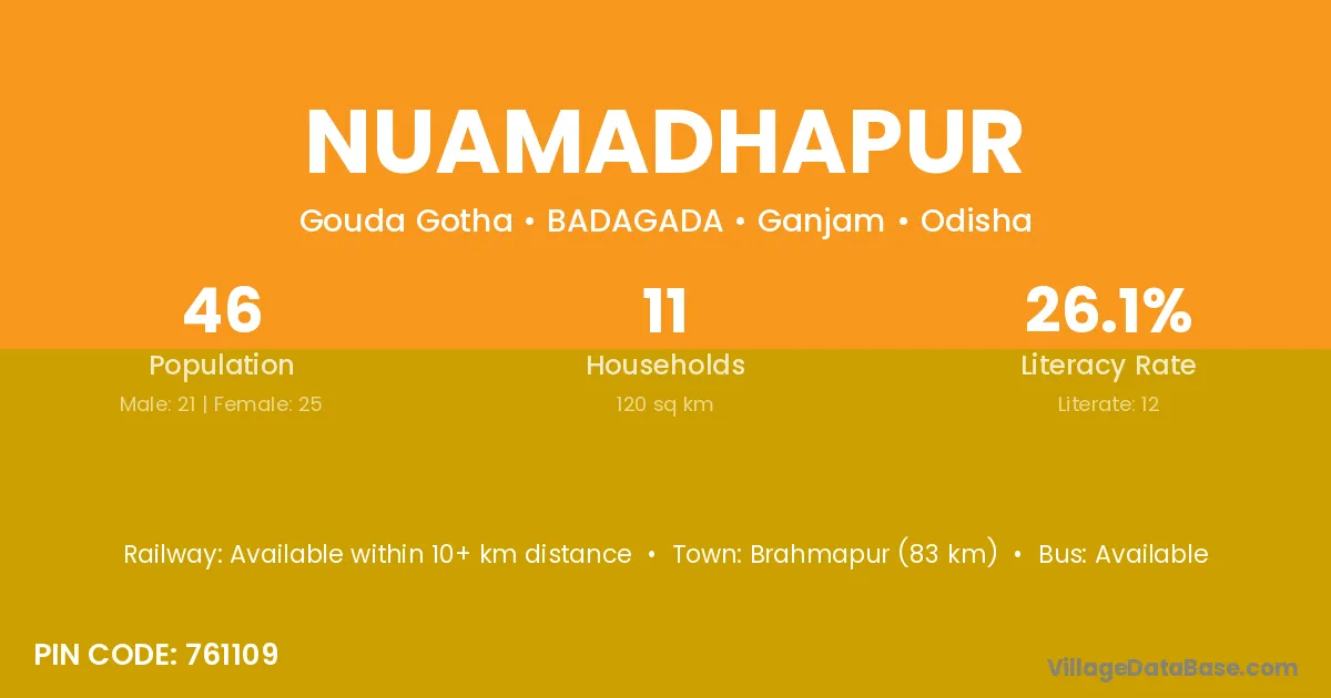 Brahmapur (83 km) is the nearest town to Nuamadhapur village for major economic activities and is located approximately 83 km away.
