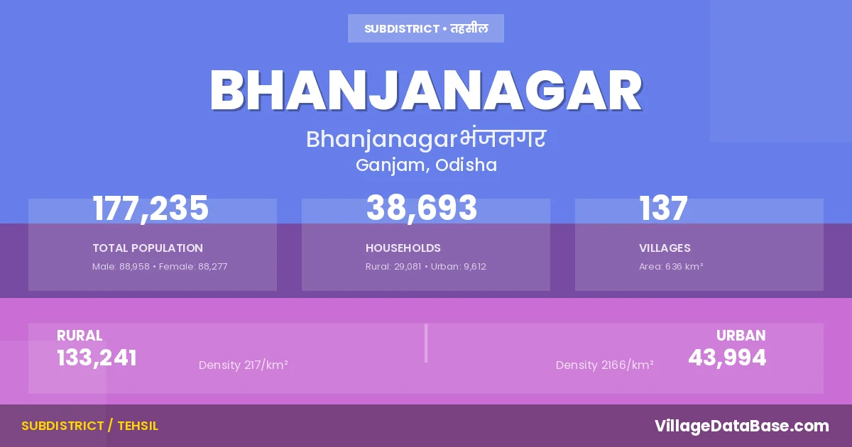 According to the 2011 census The total area of BHANJANAGAR Tehsil is 636 km², with a population of 177235 people. The population density is 279 inhabitants per square kilometre, and there are approximately 38693 houses in the sub district.