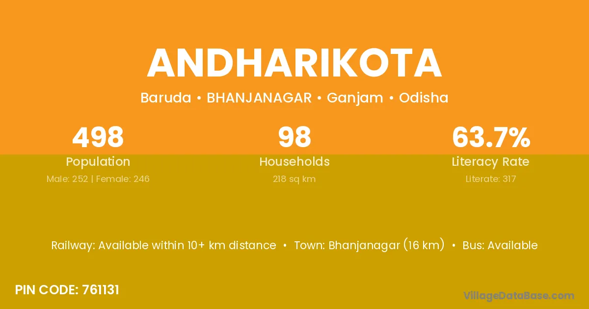 Bhanjanagar (16 km) is the nearest town to Andharikota village for major economic activities and is located approximately 16 km away.