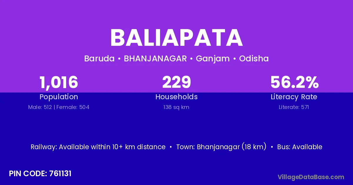 Baliapata village has a total population of 1,016 people, of which 512 are males and 504 are females.