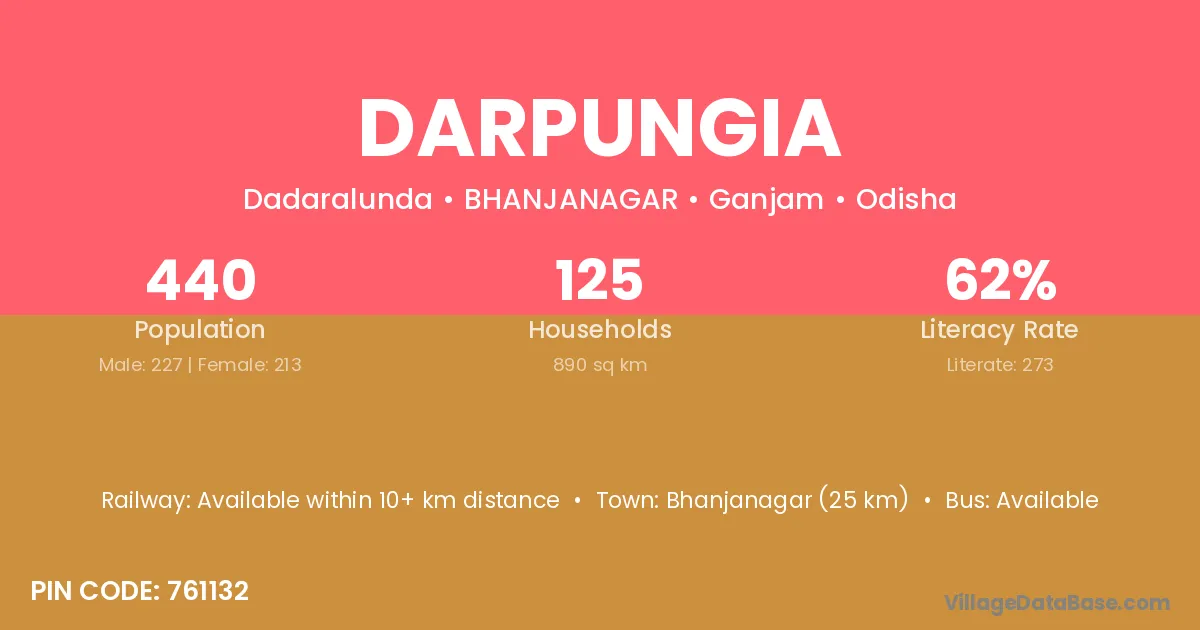 Bhanjanagar (25 km) is the nearest town to Darpungia village for major economic activities and is located approximately 25 km away.