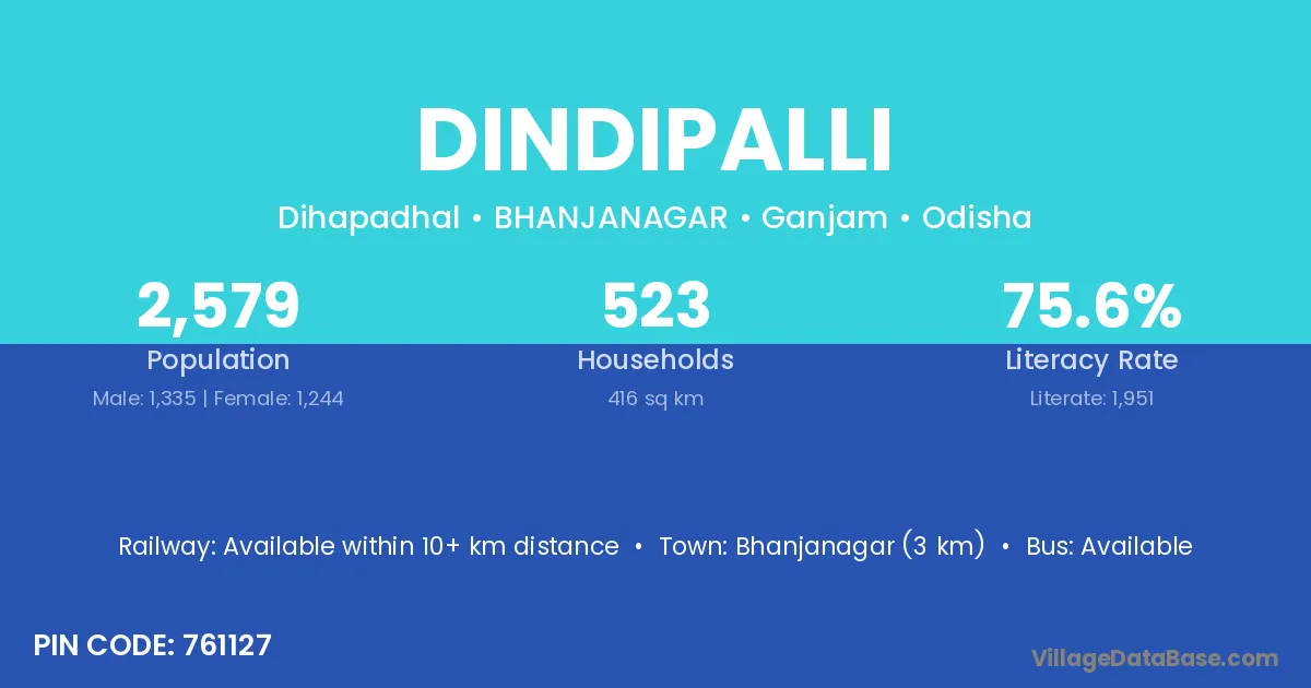 Bhanjanagar (3 km) is the nearest town to Dindipalli village for major economic activities and is located approximately 3 km away.