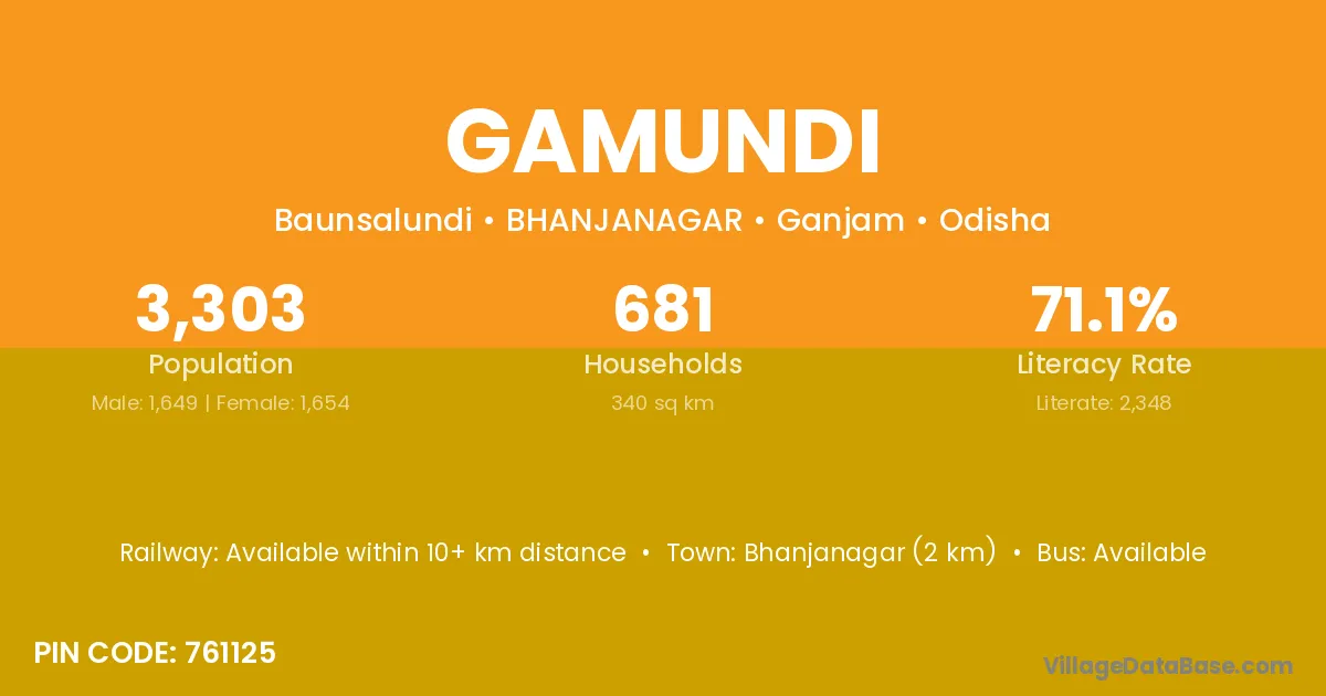 Bhanjanagar (2 km) is the nearest town to Gamundi village for major economic activities and is located approximately 2 km away.