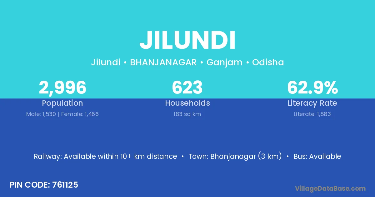 Bhanjanagar (3 km) is the nearest town to Jilundi village for major economic activities and is located approximately 3 km away.