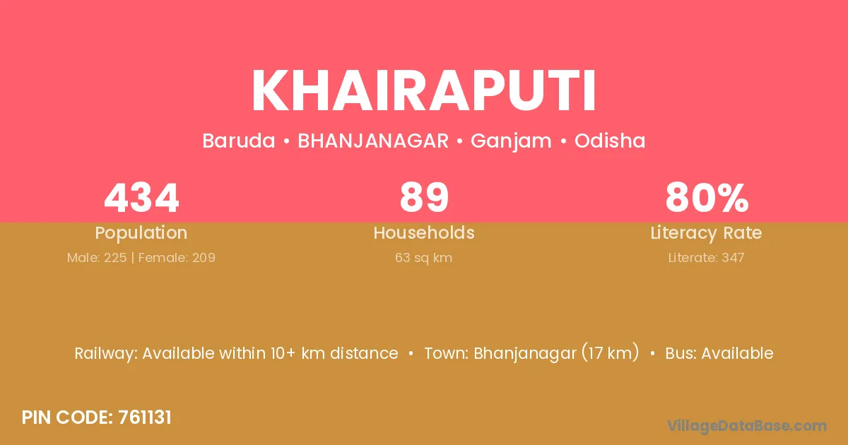 Bhanjanagar (17 km) is the nearest town to Khairaputi village for major economic activities and is located approximately 17 km away.