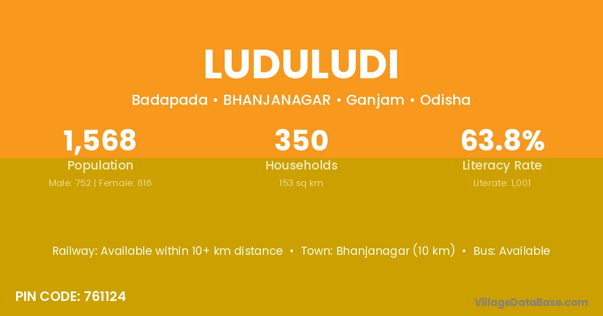 Bhanjanagar (10 km) is the nearest town to Luduludi village for major economic activities and is located approximately 10 km away.