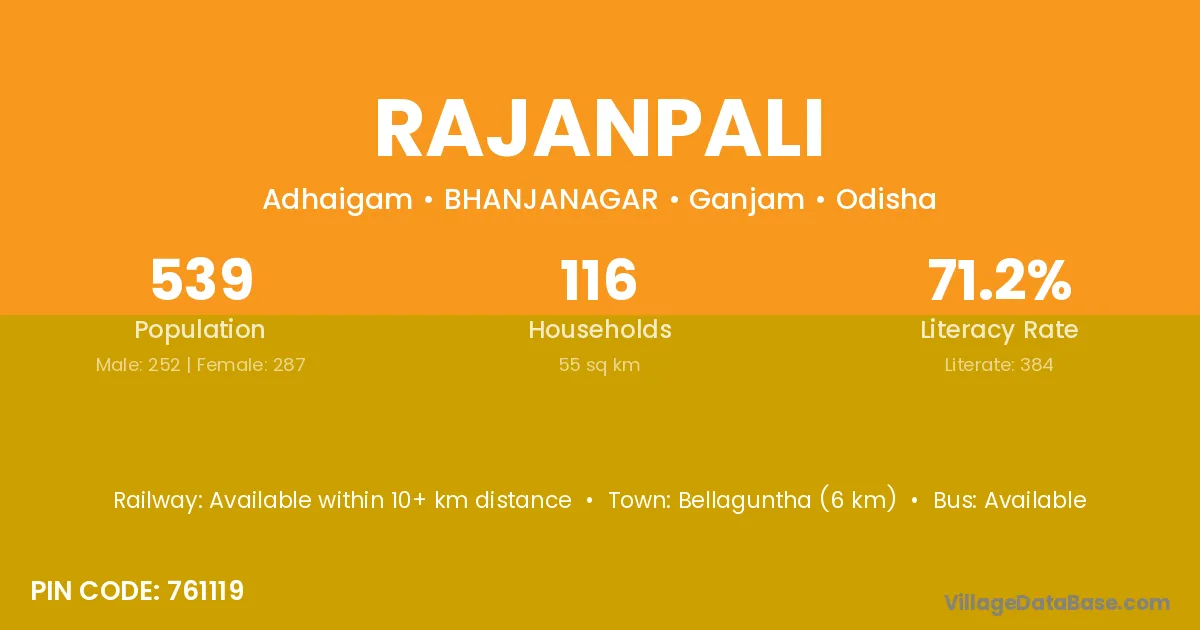 Rajanpali village has a total population of 539 people, of which 252 are males and 287 are females.