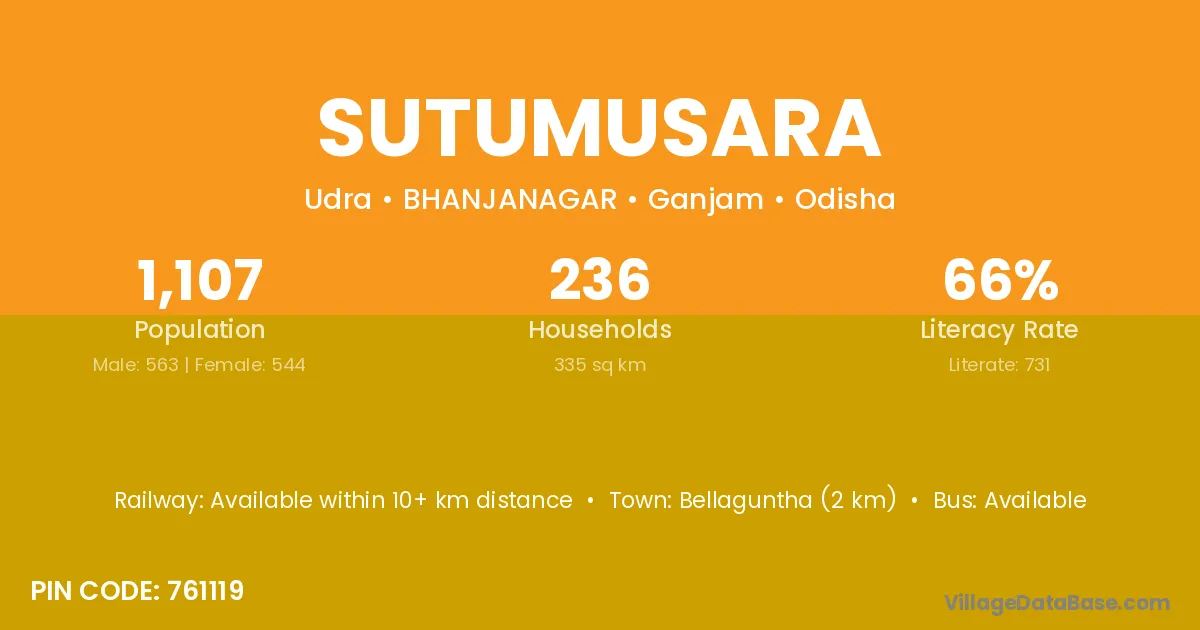 Bellaguntha (2 km) is the nearest town to Sutumusara village for major economic activities and is located approximately 2 km away.