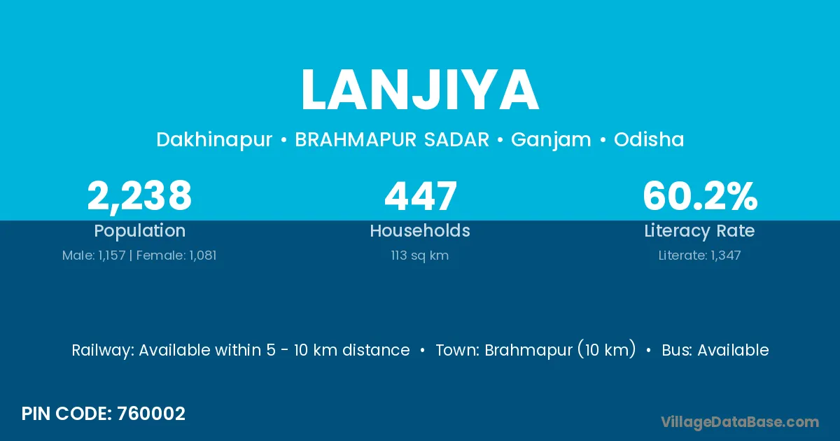 Brahmapur (10 km) is the nearest town to Lanjiya village for major economic activities and is located approximately 10 km away.