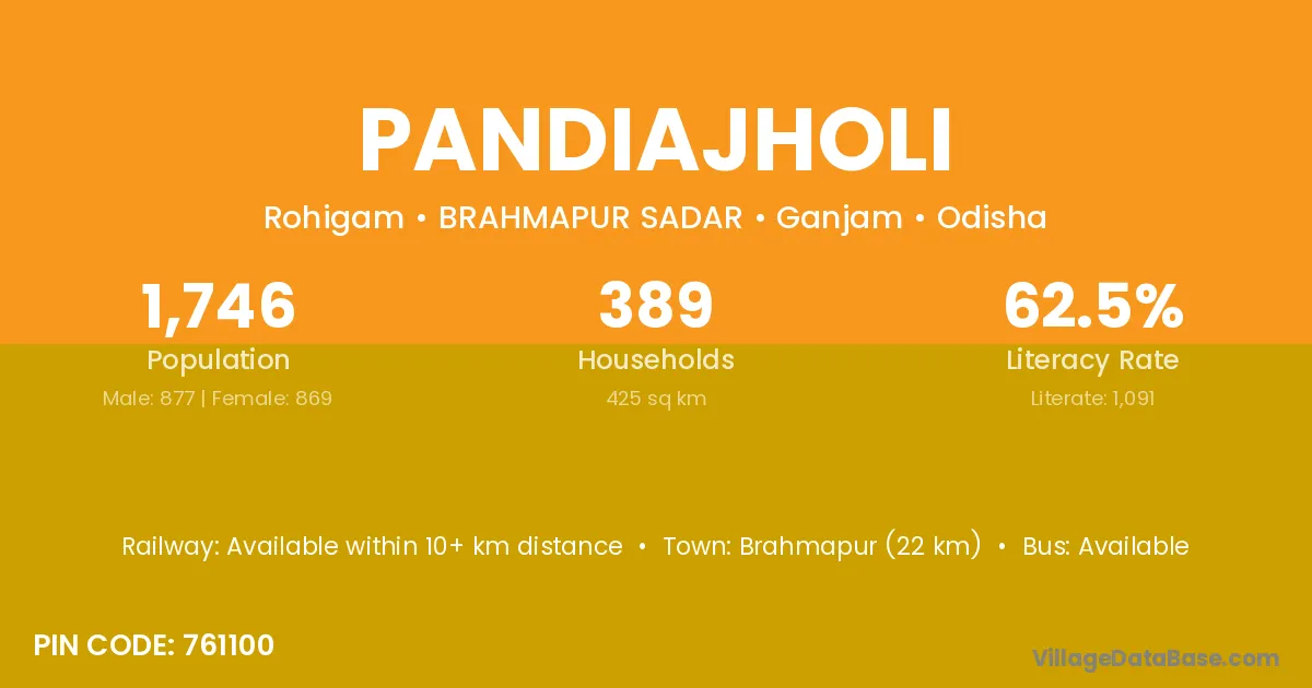 Brahmapur (22 km) is the nearest town to Pandiajholi village for major economic activities and is located approximately 22 km away.