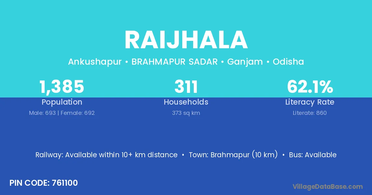 Brahmapur (10 km) is the nearest town to Raijhala village for major economic activities and is located approximately 10 km away.