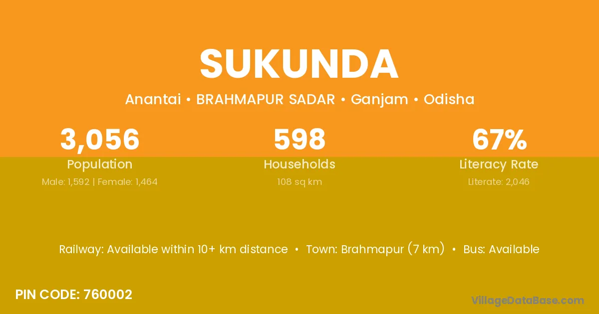 Brahmapur (7 km) is the nearest town to Sukunda village for major economic activities and is located approximately 7 km away.