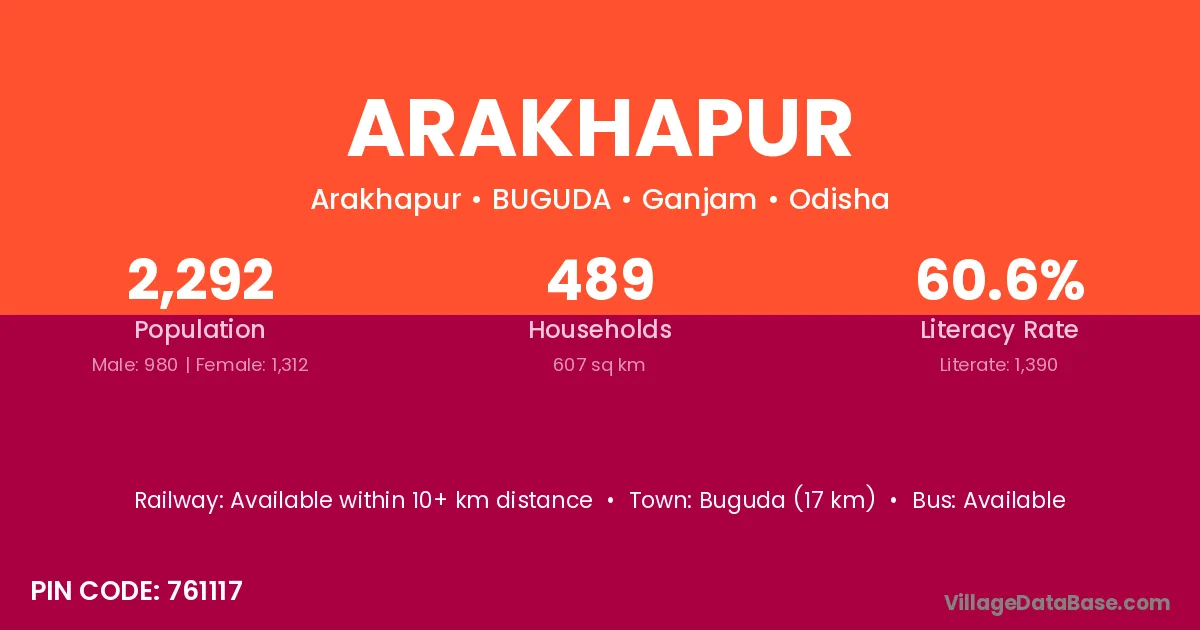Buguda (17 km) is the nearest town to Arakhapur village for major economic activities and is located approximately 17 km away.