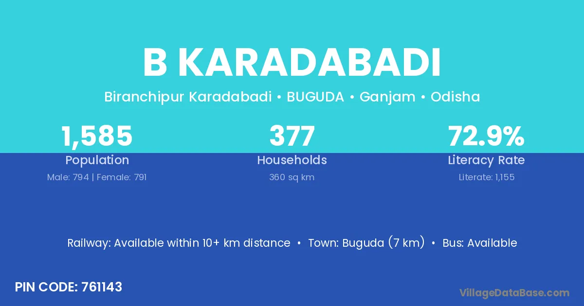 B Karadabadi village has a total population of 1,585 people, of which 794 are males and 791 are females.